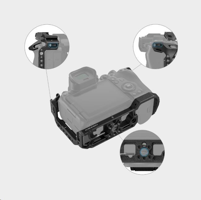Umísťuje se na Canon EOS R6 Mark II pomocí jednoho spodního šroubu 1/4"-20 a dvou bočních zajišťovacích adaptérů a má gumové podložky, které zabraňují poškrábání.