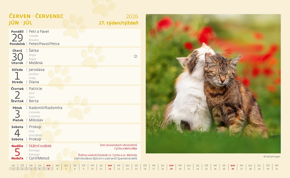 Formát kalendára: 22,6 x 13,9 cm Kalendárium: české/slovenské týždenné riadkové Počet strán kalendára: 58 + 2 Stojanček: so zámkom Priestor na potlač: 22,6 x 3 cm + 365 mačacích mien