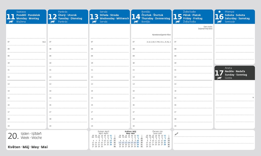 Formát: 30,1 x 18 cm Kalendárium: české/slovenské týždenné stľpcové + AJ + NJ Počet strán: 60 + 2 St