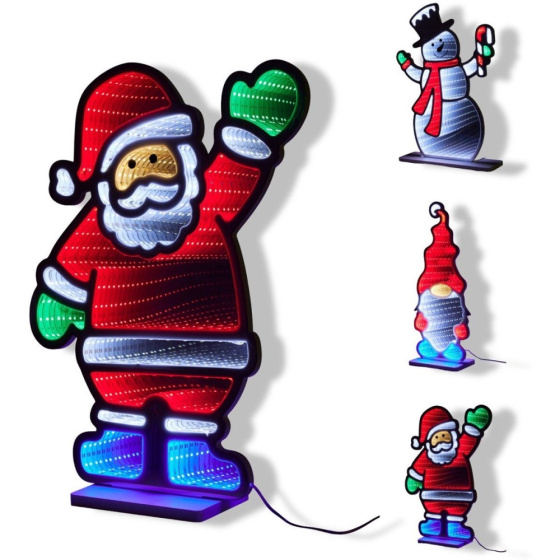Vianočná postavička s LED osvetlením v podstavci. Optický efekt využíva zrkadlo nekonečna (infinity mirror) na vytvorenie hypnotizujúceho, nekonečného odrazu LED svetiel.