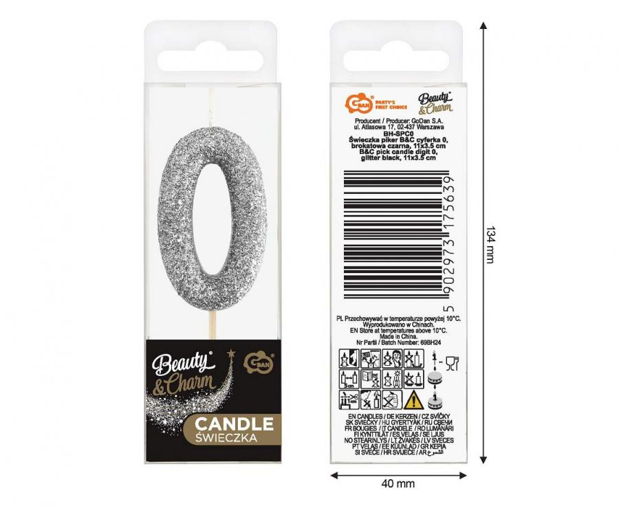 Sviečka tortová B&C - číslica "0" glitter čierna 11 cm