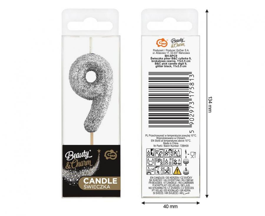 Sviečka tortová B&C - číslica "9" glitter čierna 11 cm