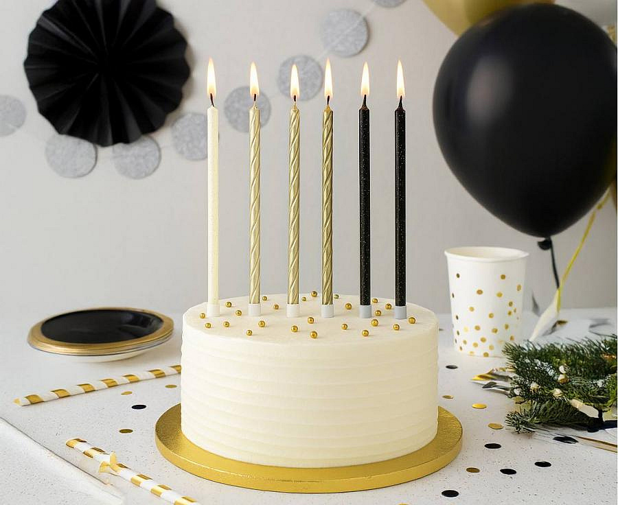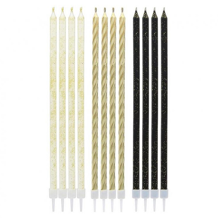 Sviečka tortová - metalická s trblietkami, čierne/biele/zlaté, 15,5 x 0,5 cm (12 ks)