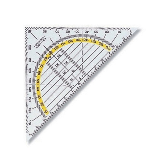Trojuholník s uhlomerom, s pravítkom na pravej odvesne 16 cm, vyrobený z transparentného PVC.