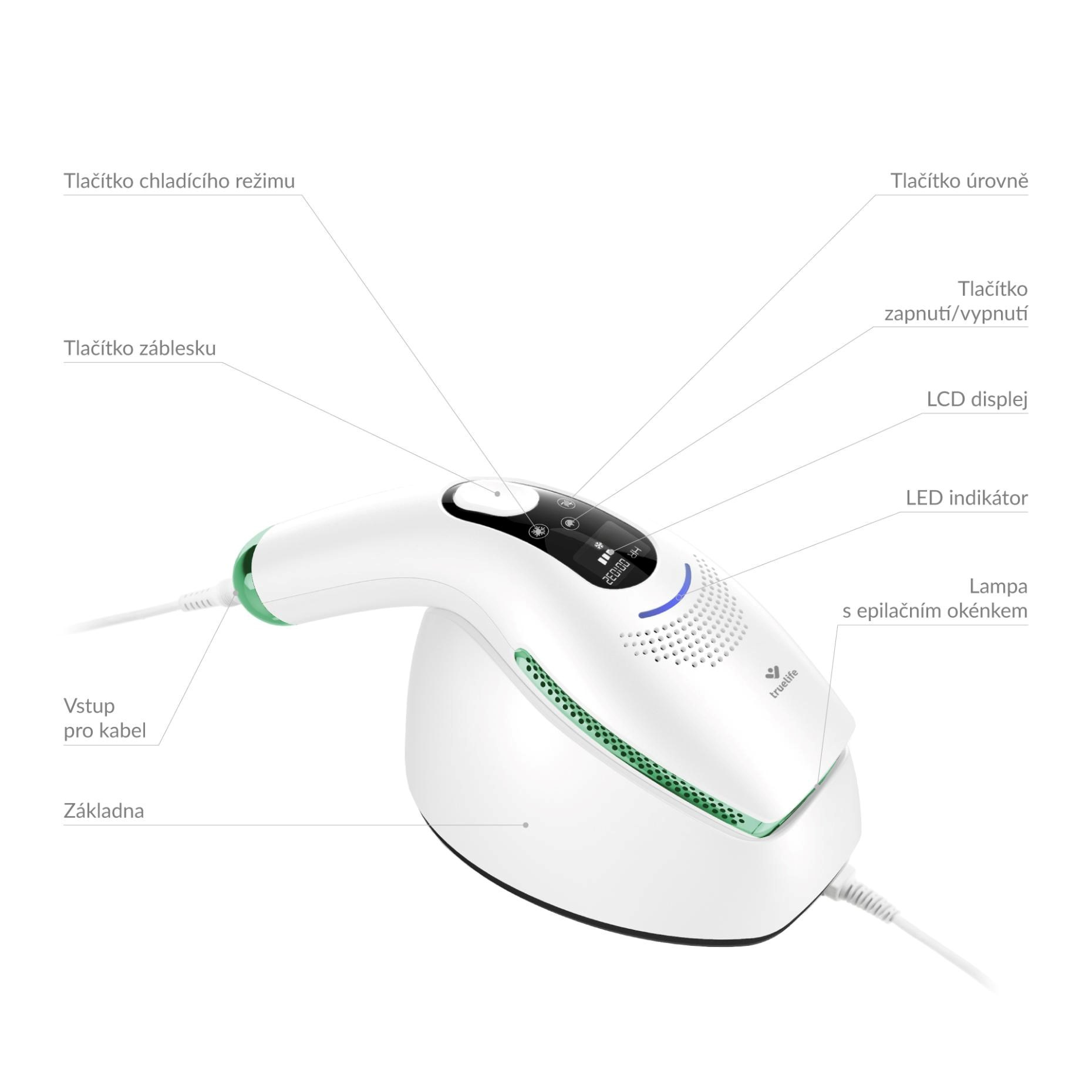 Doprajte si viditeľnejšie hladšiu pokožku už po 4 týždňoch používania epilátora TrueLife BELLE IPL EB5. Epilátor, ktorý pracuje s technológiou TrueIPL®, vás pri pravidelnom používaní účinne zbaví nežiadúcich chĺpkov. S epilátorom jednoducho ošetríte všetky partie tela, tvár a podpazušie, oblasť bikín aj celé nohy. To všetko vďaka technológii SensCool® úplne bezbolestne, šetrne a bezpečne. Epilátor vysiela záblesky, ktoré pod povrchom pokožky zasahujú melanín vo folikule chĺpku a napomáhajú tak prerušiť cyklus dorastania chĺpkov. Pravidelné používanie TrueLife BELLE IPL EB5 zanechá vašu pokožku zamatovo hebkú, bez nutnosti holenia alebo nákladných a bolestivých kozmetických ošetrení. Použitie epilátora je jednoduché a zvládne ho každý. Okrem klasickej lampy k odstraňovaniu chĺpkov v balení nájdete aj špeciálnu SR lampu určenú na omladenie pokožky a AC lampu, ktorá vám pomôže s odstránením akné.