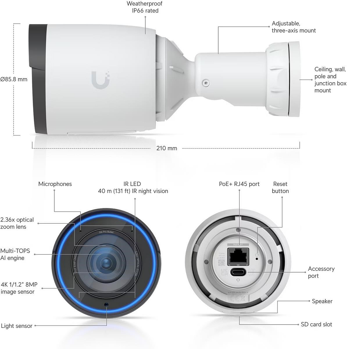 Popis produktu Ubiquiti G6 Pro Bullet disponuje 8MP snímačem (3840 x 2160px) při 30 fps, variofokálním objektivem (2,36x optický zoom), adaptivním IR přísvitem pro noční vidění na vzdálenost až 40m. Kamera má odolné šasi z hliníku a polykarbonátu, krytí IP66 proti prachu a tryskající vodě. Do sítě lze kameru připojit pomocí Gigabit LAN s podporou napájení přes PoE (37 až 57V DC) s maximální spotřebou 15W. Klíčové vlastnosti 4K (8MP), 30 FPS video (3840 x 2160px) Pokročilá AI detekce nejrůznějších objektů a událostí Noční režim s IR LED diodami, IR cut filtr IP66 kryt odolný proti povětrnostním vlivům IK04 odolnost vůči vandalům Napájení pomocí PoE (37 až 57V DC) Spravováno softwarem UniFi Protect Vestavěné mikrofony a reproduktor Provedení v bílé barvě Obsah balení Zařízení Šroubky, hmoždinky Držáky na zeď/strop a stožár Technické parametry Kamera Zoom (optický):31x Typ objektivu:Varifokální - motorický Objektiv [mm]:5,9 až 13,8 (nastavitelný) Přísvit:IR Dosah přísvitu [m]:40 Pozorovací úhel [°]:45,5 až 113,8 Režim den/noc:IR cut filtr Obrazový senzor ["]:1/1.2 Obraz Rozlišení:8MP Max. rozlišení [pixely]:3840 x 2160 (4K UHD) Konektory a rozhraní Slot na paměťové karty:microSD Audio:2 Mikrofony, Reproduktor Rychlost LAN:(1) 1000Mbps Napájení Napájení přes PoE:802.3at, 37 .. 57V DC Typ napájení:PoE Max. spotřeba energie [W]:15 Fyzické charakteristiky Stupeň krytí:IP66 Použití:Venkovní Antivandal (ochrana proti nárazu):IK4 Tlačítka:Reset Provozní teplota [°C]:-20 až 50 Hmotnost [g]:752 Šířka [mm]:86 Výška [mm]:86 Hloubka [mm]:106 Barva:Bílá Hardware CPU:Quad-Core ARM Cortex-A53 Obecné Kamerová řada:UniFi Protect.