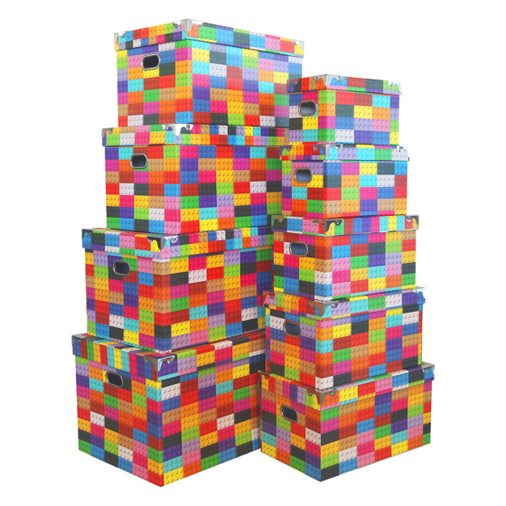 Krabice z pevného kartónu s prekovenými rohmi a otvormi na prsty, vhodné do detskej izby na uloženie hračiek, šiat, rôznych drobností.
