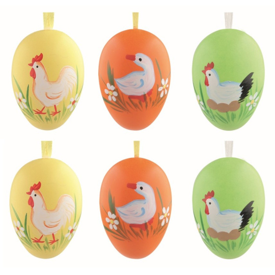 Farebné vajíčka maľované slepičkami, husami so stužkou na zavesenie vyniknú takmer v každom interiéri.Sada 6 ks v sáčku.