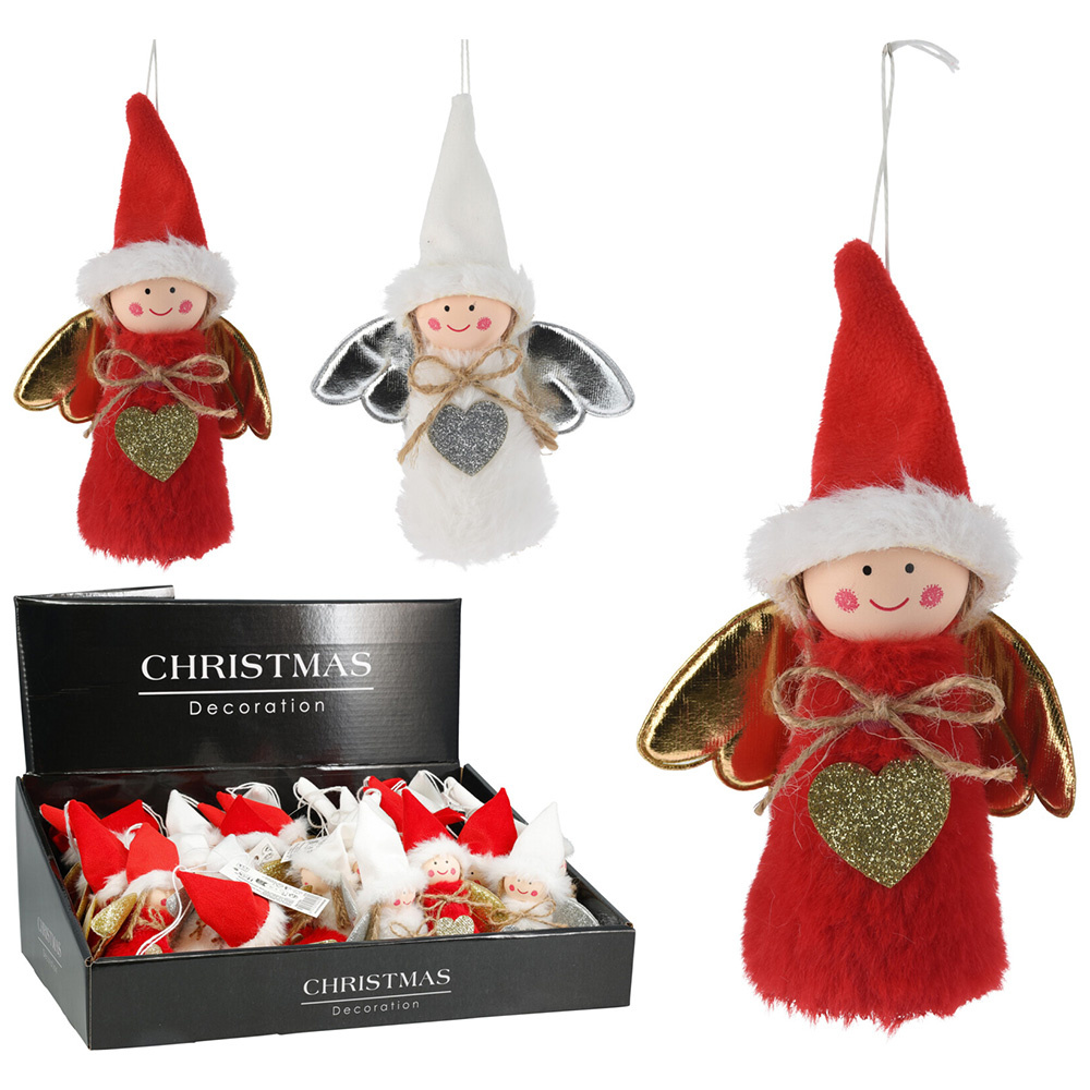 Figúrka anjela s krídlami a srdcom, so zamatovou čiapkou, telo z umelej kožušiny a stuhou na zavesenie.