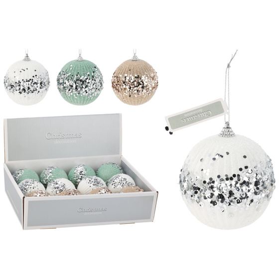 Vianočná guľa dekorovaná trblietavými flitrami.