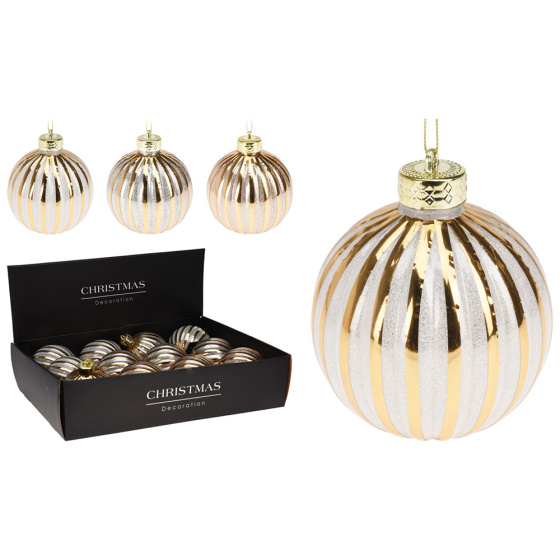 Vianočná guľa lesklá zlatá / trblietavá, pruhovaný vzor.