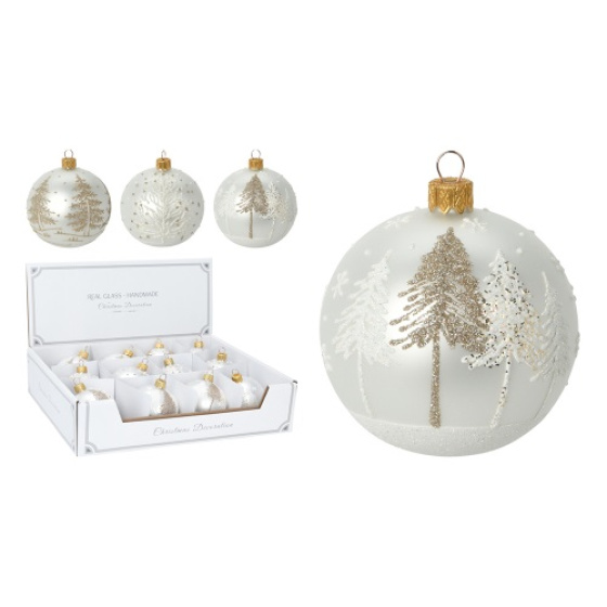Ústami fúkaná sklenená vianočná guľa biela dekorovaná so zlatými trblietkami / 3 dizajny s motívom vianočného stromčeka.
