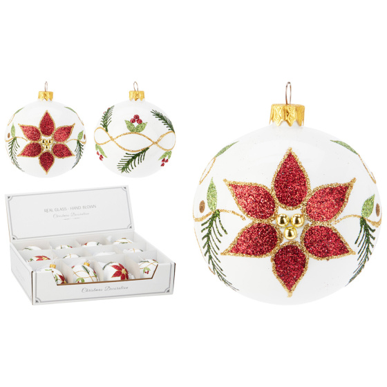 Vianočná guľa 80 mm biela, glitrovaný dekor (mix 2 dizajnov, cena /1 ks)