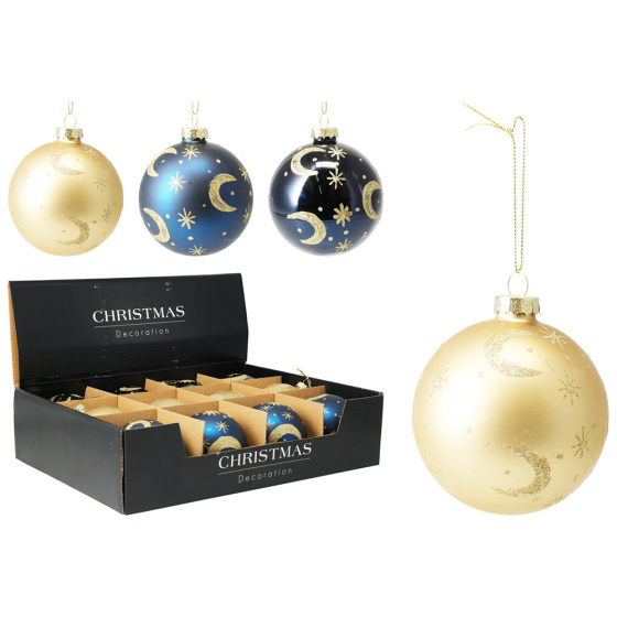 Vianočná guľa modrá matná / lesklá a zlatá matná, trblietavý dekor (3 dizajny).