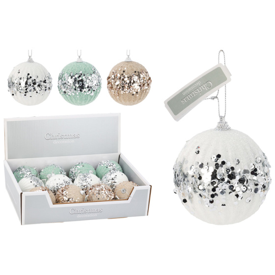 Vianočná guľa 80 mm dekorovaná flitrami (mix 3 farieb, cena /1 ks)