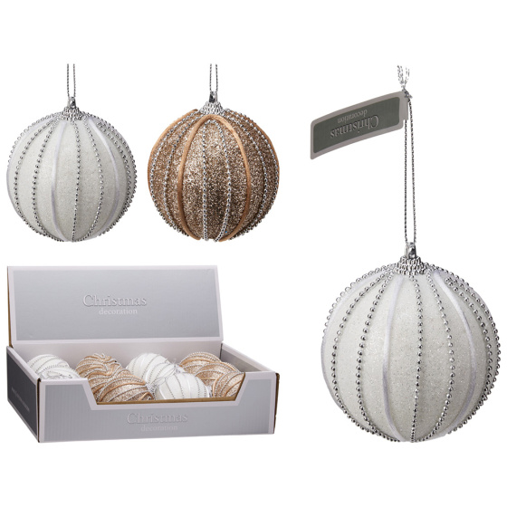 Vianočná guľa trblietavá, dekorovaná gorálkami.