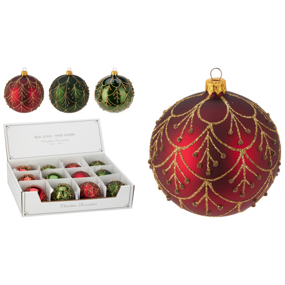 Vianočná guľa matná červená / matná zelená / lesklá zelená, dekorovaná trblietavým vzorom v zlatej farbe.