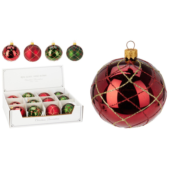 Vianočná guľa matná červená / lesklá červená / matná zelená / lesklá zelená, dekorovaná trblietavým vzorom v zlatej farbe.