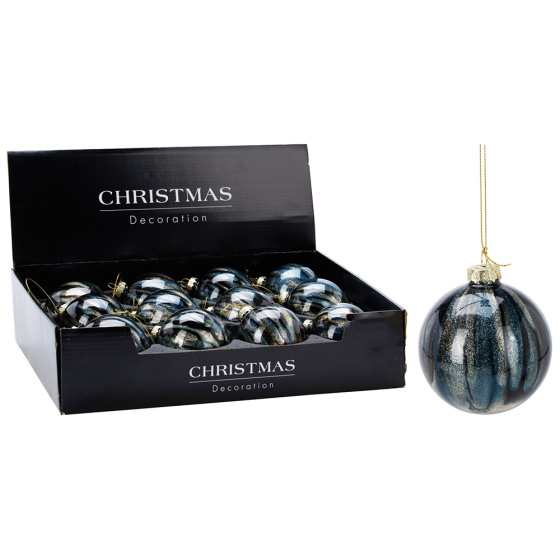 Vianočná guľa s trojfarebným vzorom modrá, čierna a zlatá farba. priemer ozdoby: 8 cm čiapka a šnú
