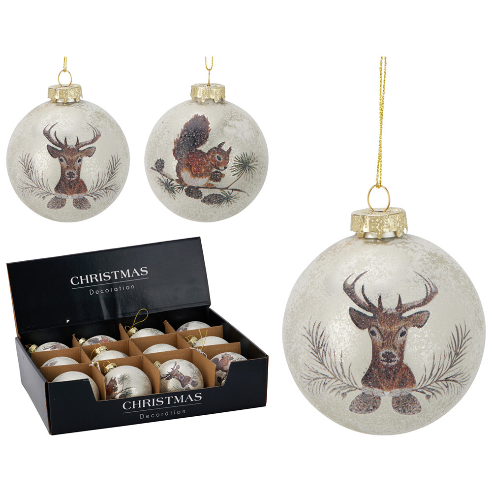 Vianočná guľa zlatá šampaň, dekor s jeleňom / veveričkou (2 dizajny).