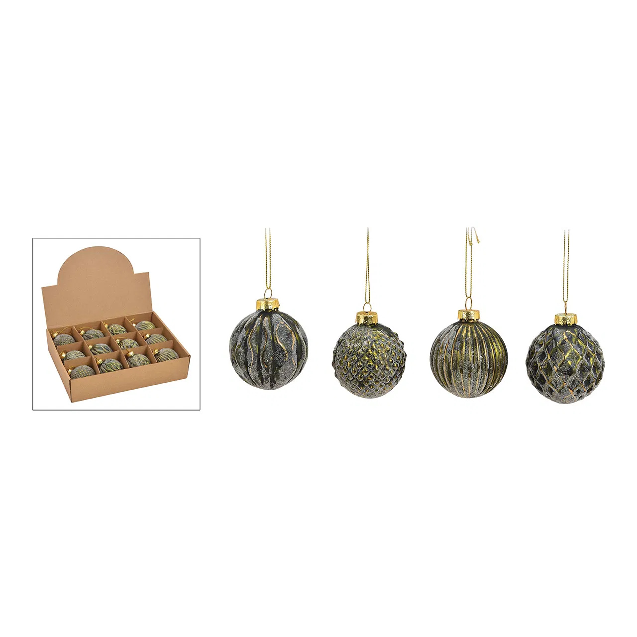 Vianočná guľa sklenená 6 cm zelená /zlatá farba /glitter (mix 4 dizajnov /cena za 1 ks)