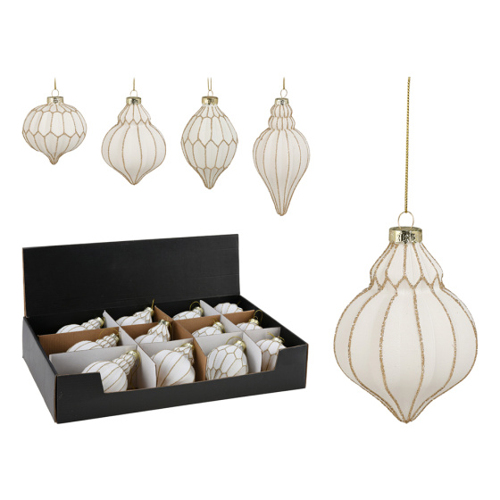 Vianočná ozdoba na zavesenie v bielej matnej farbe, zdobená zlatým dekorovaním a zlatou šnúrkou.