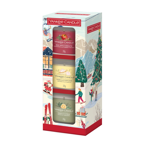 Set sa skladá z votívnych sviečok v skle Red Apple Wreath, Sage & Citrus, Vanilla Cupcake.