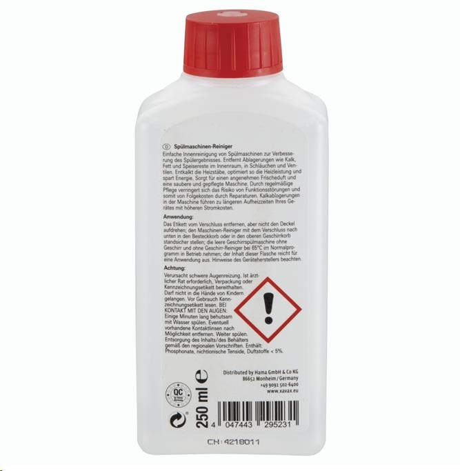- jednoduché čištění uvnitř myček na nádobí pro lepší výsledky při umývání - odstraňuje usazeniny vodního kamene, mastnoty a zbytky jídla z vnitřku, hadic, trysek a ventilů - odvápňuje ohřívací těleso, čímž optimalizuje výkon a šetří energii - zanechává svěží vůni - objem: 250 ml - vyrobeno v Německu Poznámka pro spotřebitele: Usazeniny vodního kamene způsobují následující: - delší čas ohřevu a tím i vyšší spotřeba elektrické energie = vyšší náklady - náklady na časté opravy Použití: Z uzávěru odstraňte nálepku, uzávěr neodstraňujte. Lahev s čistícím prostředkem postavte uzávěrem dolů do koše na příbory do myčky na nádobí nebo do horního koše na nádobí tak, aby zůstala pevně stát uzávěrem dolů. Prázdnou myčku na nádobí (bez nádobí i bez mycího prostředku) zapněte na běžný program při 65°C. Čistící prostředek je určený na jedno použití..