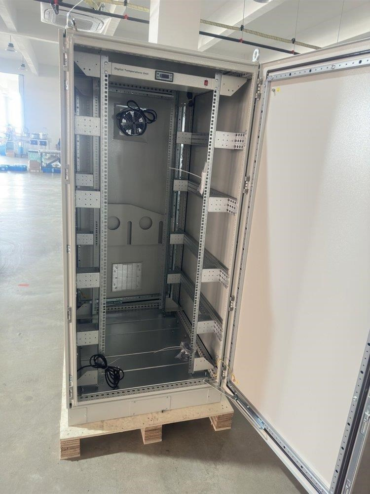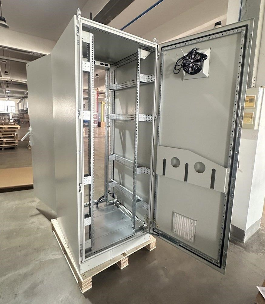 Rozvádzač pre inštaláciu dátových a telekomunikačných zariadení, ventiláciu s termostatom, podstavec, šedý.