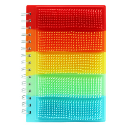 Poznámkový blok so špirálou pre ľahké listovanie a bezokrajové písanie.Mäkká, silikónová obálka s relaxačnými, masážnymi prvkami.