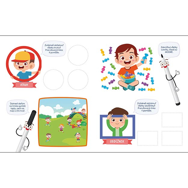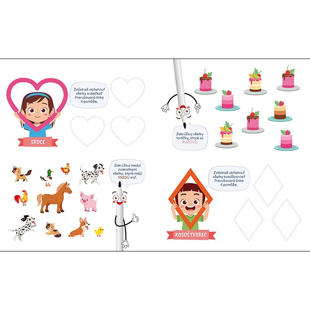 Titul obsahuje 22 stierateľných strán s úlohami na trénovanie predškolských zručností.