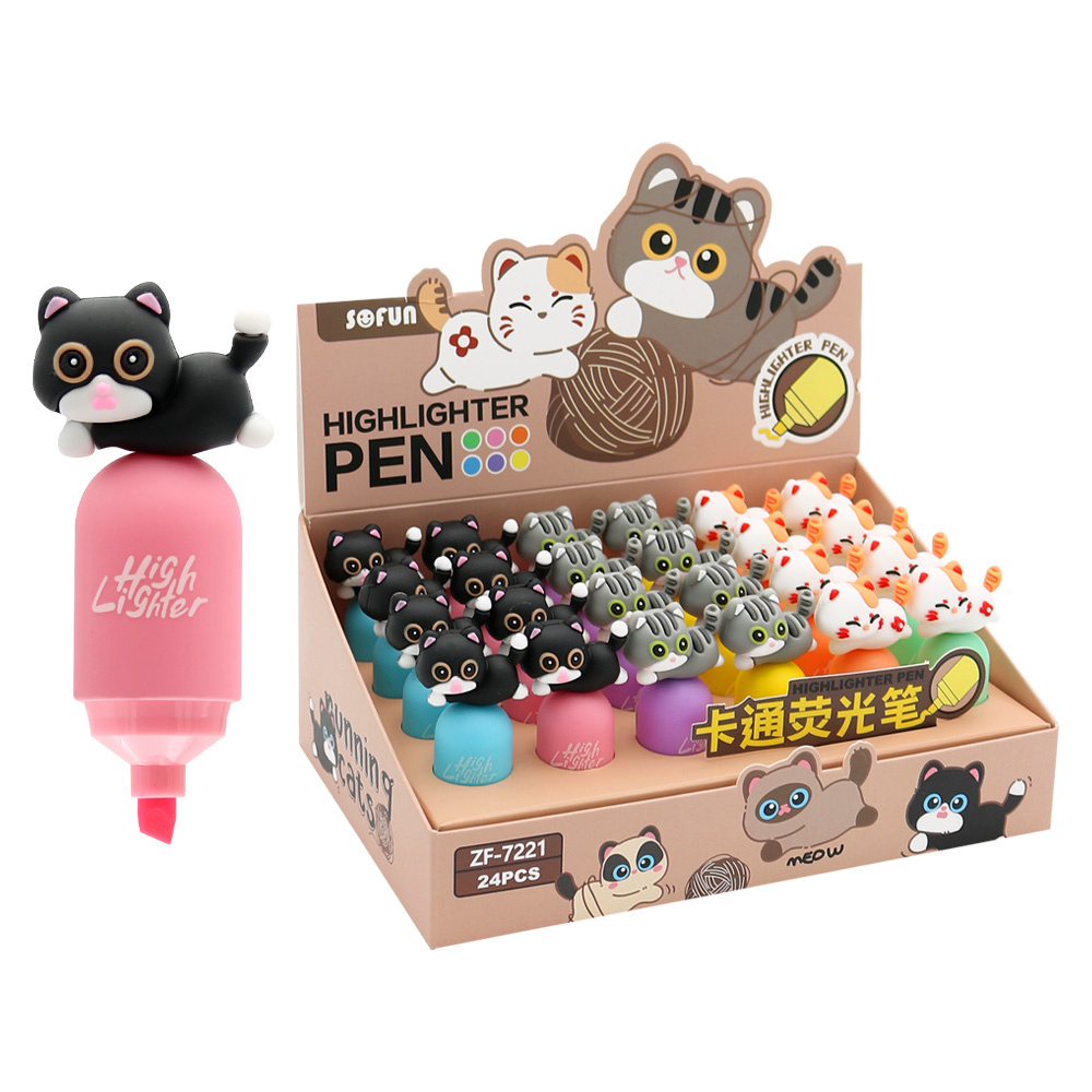 Mini zvýrazňovač s gumenou figúrkou hravého mačiatka a hrubým telom dobre padne do malej detskej ruky.